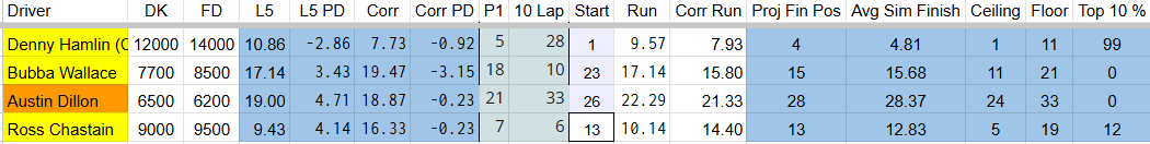 Denny Hamlin ($12,000 DK, $14,000 FD): This is completely a gut play and mostly illogical. Hamlin is the most expensive driver of the slate and starting on the pole, but both Larson and Byron seem to have a better car. In fact, my model predicts Larson to win and Byron to dominate whilst projecting Hamlin to finish 4th. Data be damned, this is Hamlin’s year. Starting on the front row is a major advantage, although it seems like the driver starting second is more likely to dominate, and my gut is telling me that Hamlin will find a way to run away with the race.