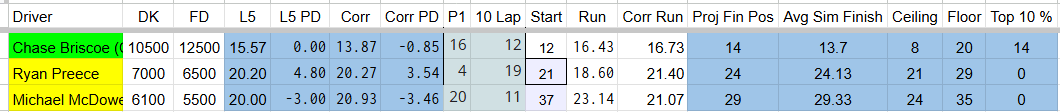 Key: L5= Avg Fin here since 2022 , L5 PD= Avg Place Diff here since 2022, Corr= correlated track average finish 2024, Corr PD= correlated track average PD 2024, P1= practice 1 single lap rank, 10 lap= practice 1 10 lap average rank, Start = Starting Pos, Run= avg run position here since 2022, Corr Run= correlated track avg run position 2024, Proj Fin Pos= machine learning model predicted finishing position, Avg Sim Fin= avg finishing position over 100 simulated races, Ceiling- best finishing position over 100 simulated races, Floor= worst finishing position over 100 simulated races, Top 10%= number of times the driver finished in the top 10 over 100 simulated races.