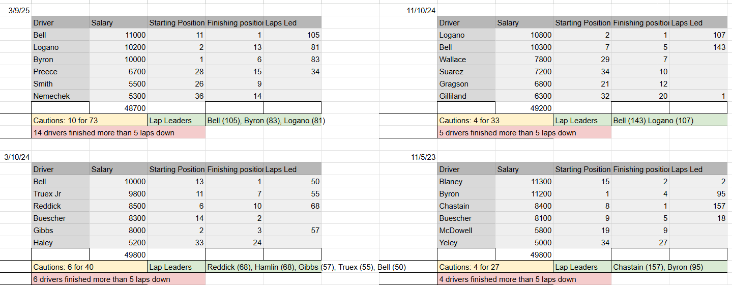 All eyes will be on Allmendinger starting last and offering a $100 discount, but I love Gilliland starting 30th. He offers some protection from being lapped early and comes in with a 3 race top 20 streak at Phoenix. Gilliland is a pure punt, but he still has top 15 upside, and that is all we can ask for with drivers in this range.